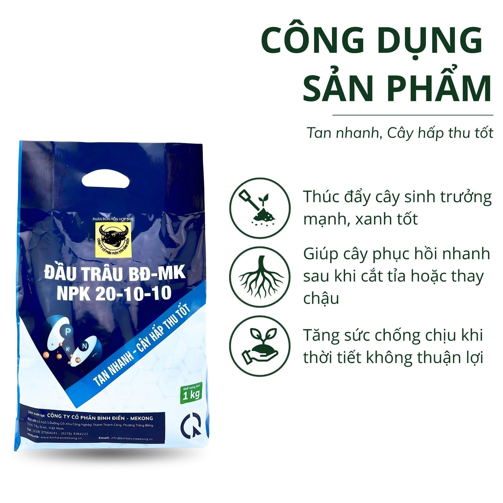 Cân đối dinh dưỡng giúp cây phát triển đồng đều. Thúc đẩy quá trình trao đổi chất trong cây, giúp cây hấp thu dinh dưỡng hiệu quả hơn, nâng cao năng suất và chất lượng nông sản. Giảm hiện tượng vàng lá, còi cọc do thiếu dinh dưỡng, đặc biệt trong điều kiện đất trồng giới hạn như chậu, thùng xốp Tăng khả năng chống chịu với thời tiết khắc nghiệt